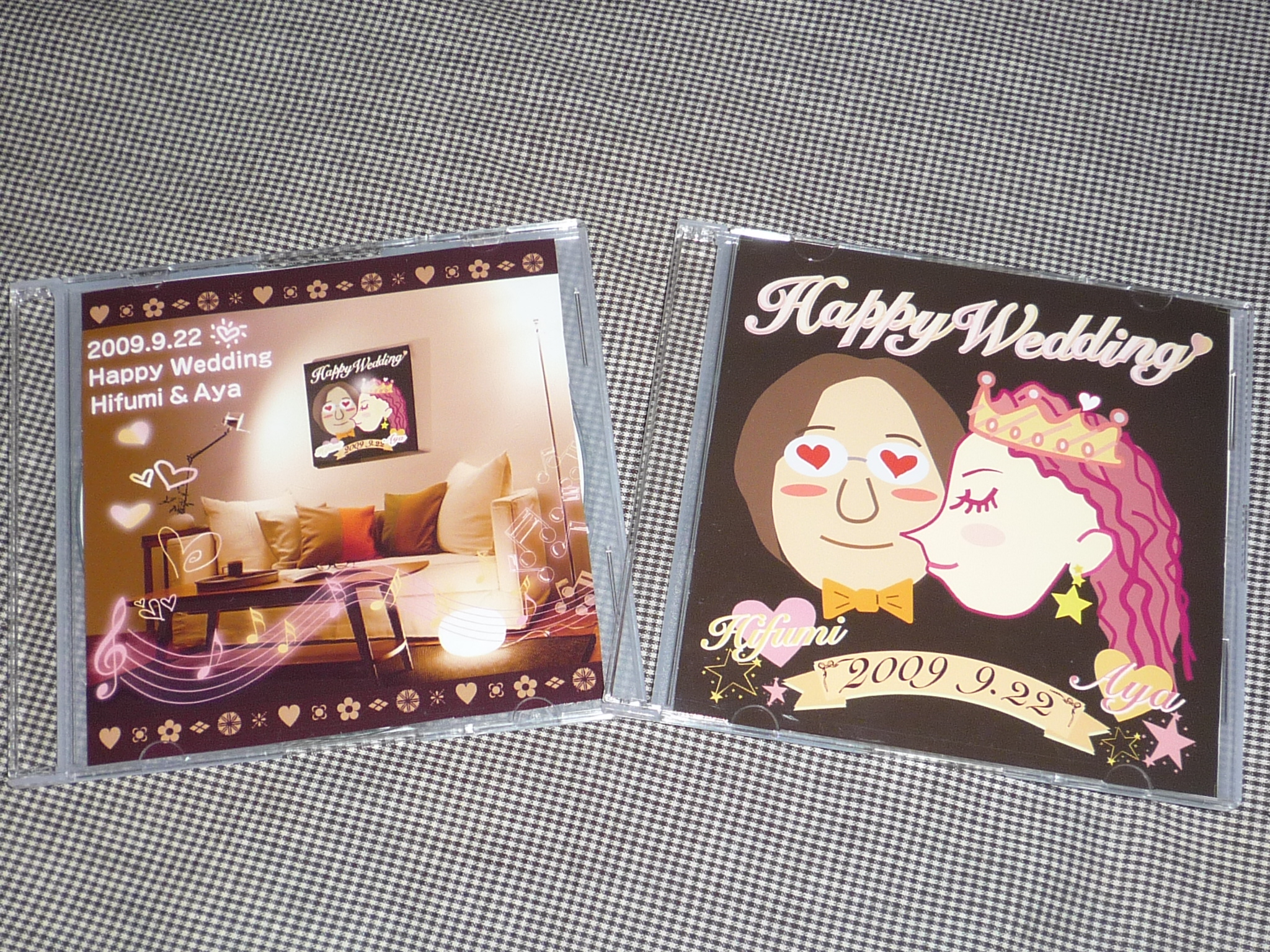 シルバーウィーク中に、親友の結婚式にも出席してきました左の写真は、新郎新婦の似顔絵を描いたウエディングケーキ村上くんにデザインを手伝ってもらって、それをケーキ屋さんに再現してもらいましたこちらはパーティーの際、BGMとして流していた2人の思い出の曲を集めたCDこれも村上先生による力作今回、幹事をさせてもらい、思い出に残るパーティーになってホントに良かったです末永くお幸せに
