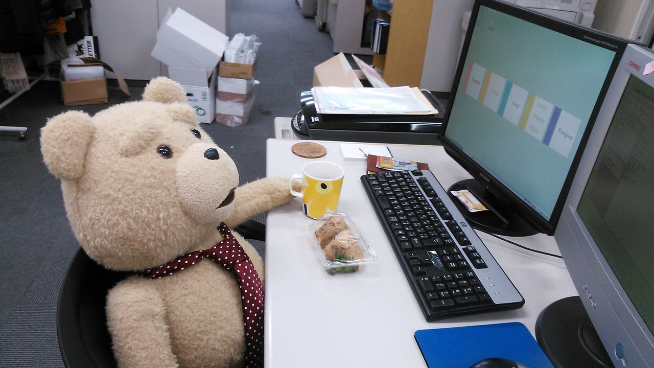 近々、新商品の発売もひかえて何かとバタバタしている今日この頃猫の手も借りたいと言っていたら・・・クマの手を貸してやるよ・・・と、テッドが手伝いに来てくれました