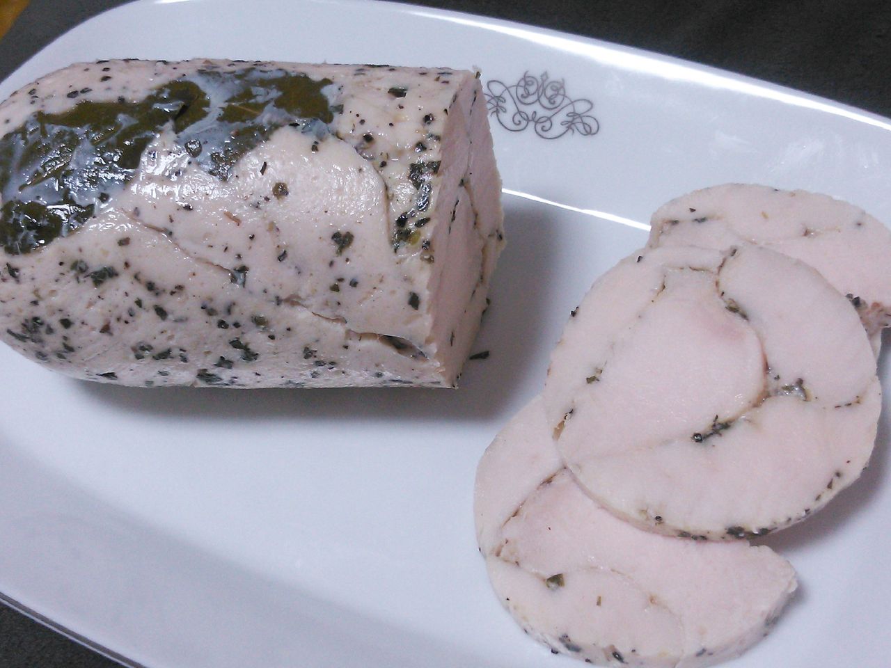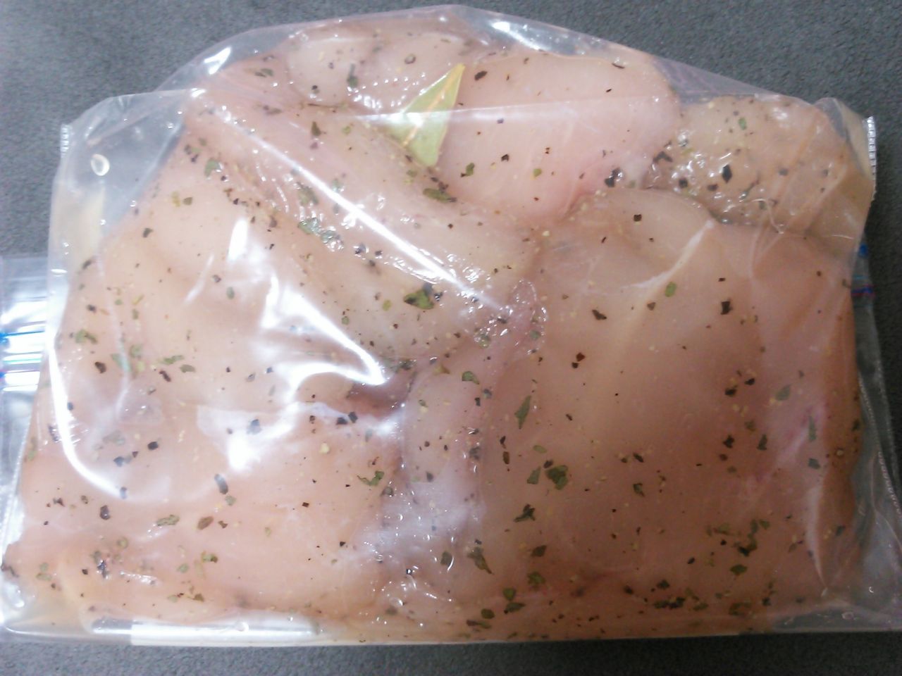 まず、鶏のムネ肉に塩・砂糖・黒コショウ・バジル・ローリエで下味を付け、密閉したまま冷蔵庫で2日間寝かせます![]()