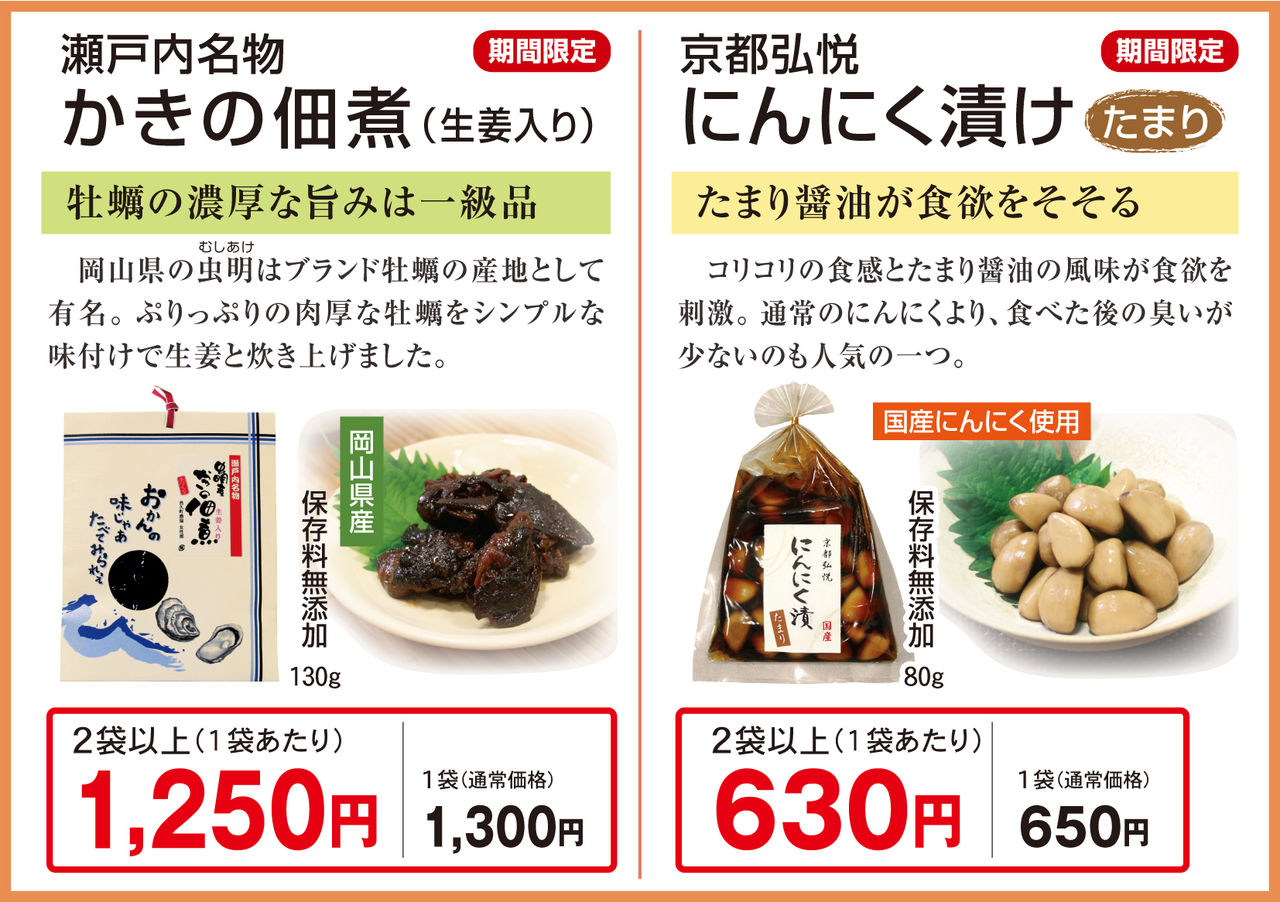 こちらは昨年も販売して大人気だったかきの佃煮とにんにく漬け