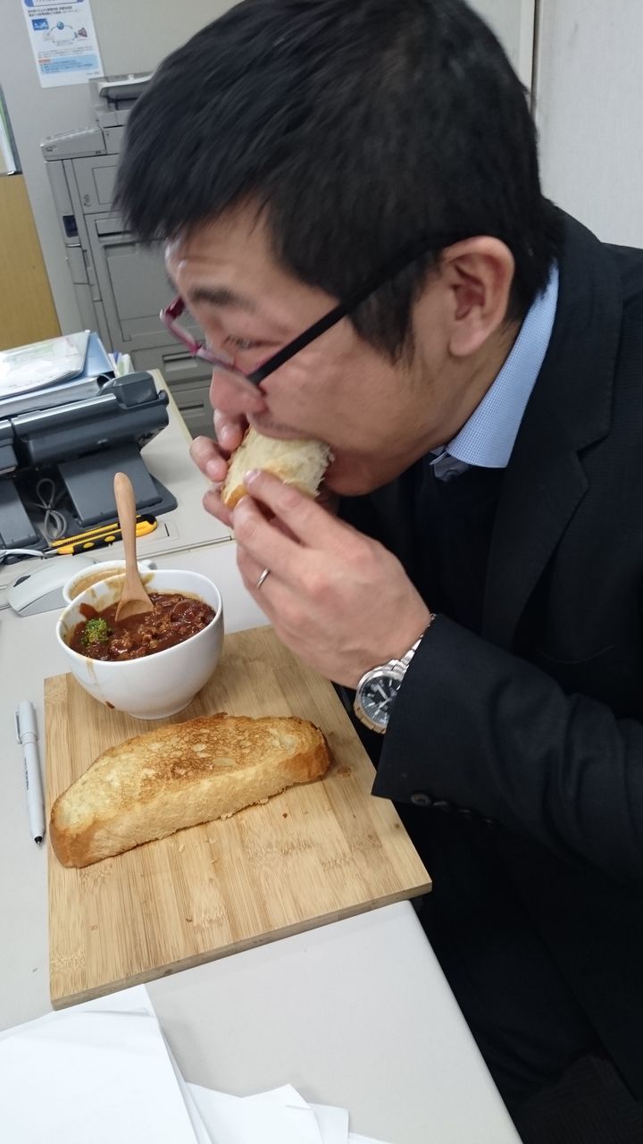 課長が敷いている木のボードはまな板なのですが、パンを置くとちょっとお洒落な感じに見えます![]()