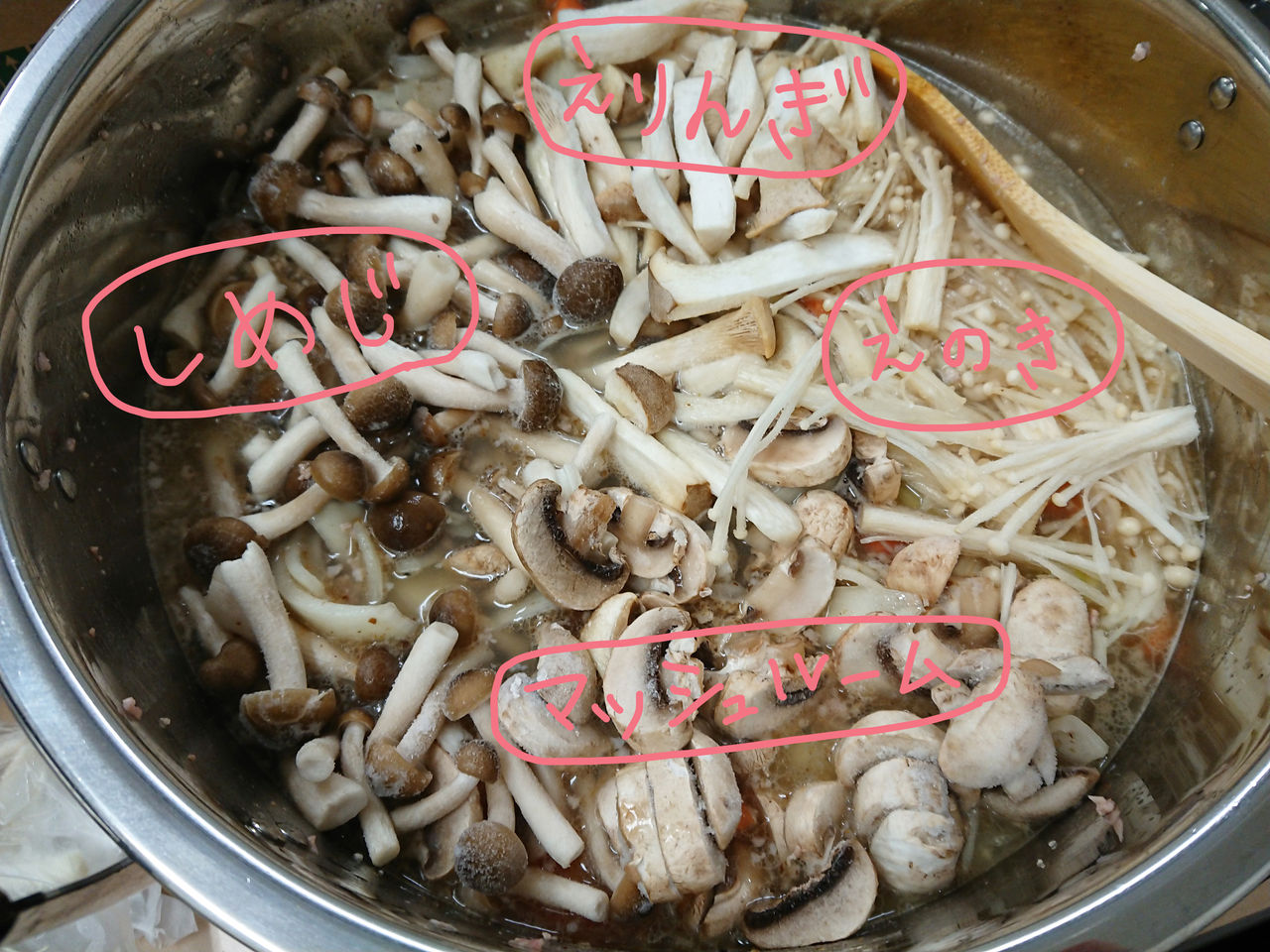 凍ったままのえりんぎ、えのき、マッシュルーム、しめじの4種類を入れます。