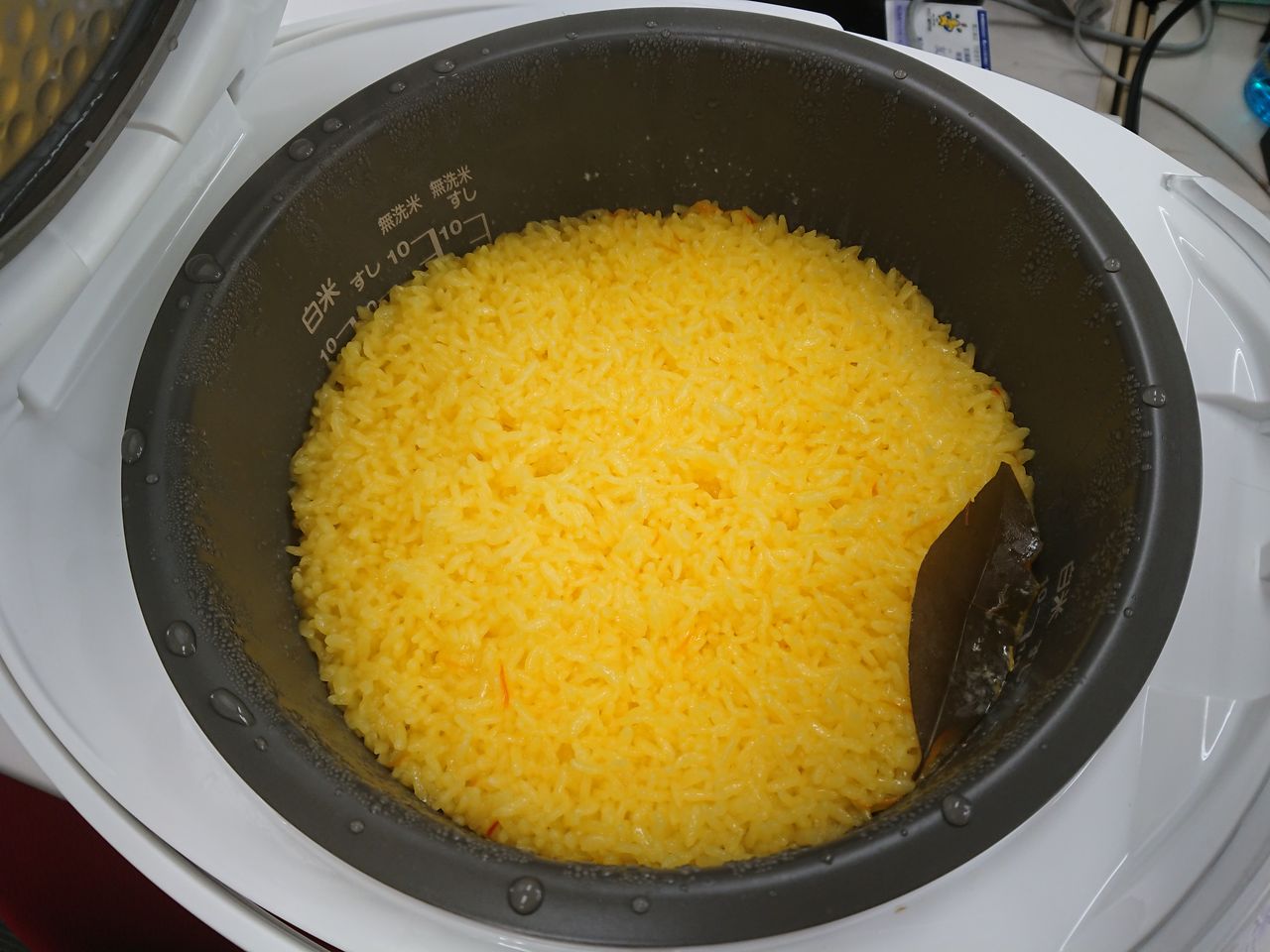 めっちゃきれいな黄色に炊きあがり、ほのかに異国の香り漂うサフランライスが出来上がりました![]()