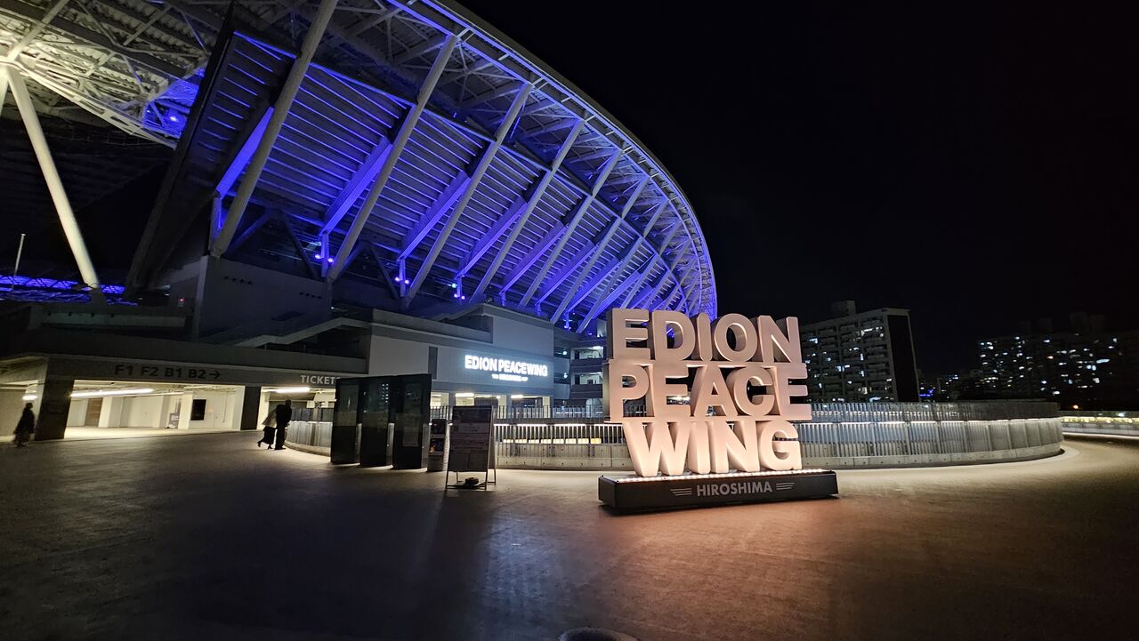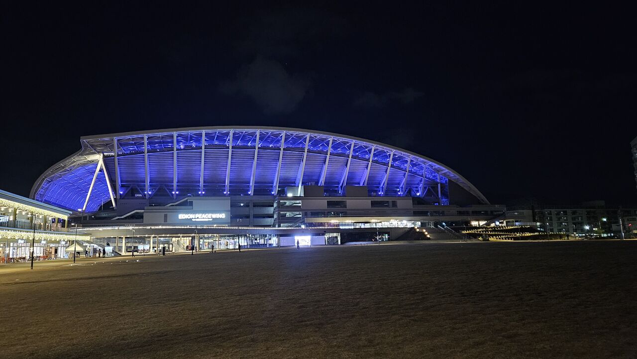 スタジアムのすぐ近くで晩御飯を食べたので、お店を出る頃には暗闇に浮かびあがるスタジアムが