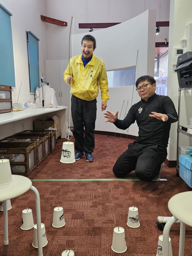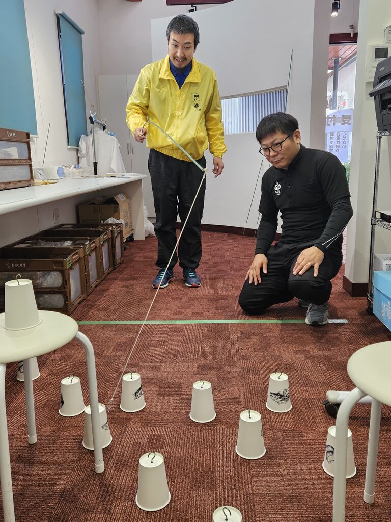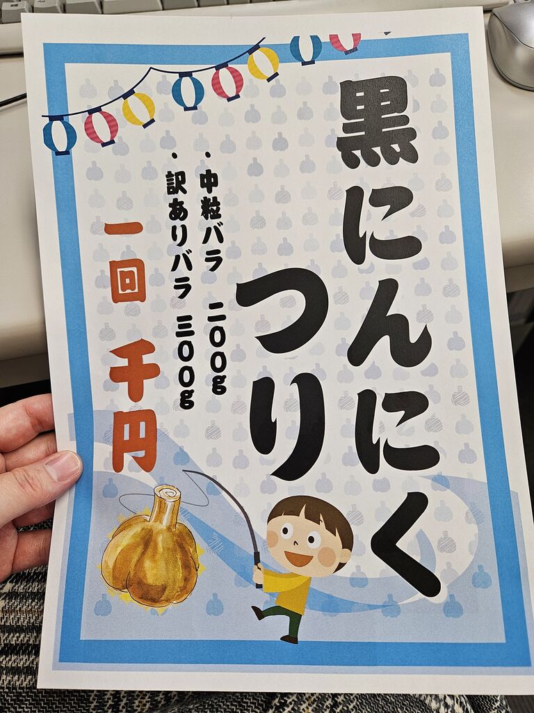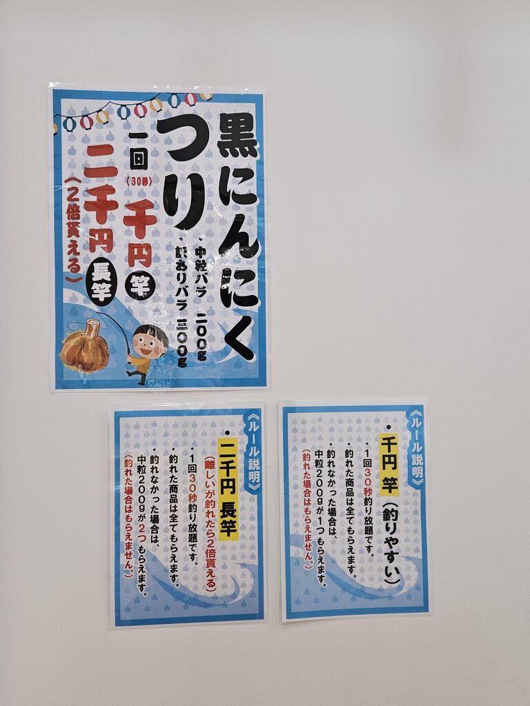 30秒の時間制限内に、S字フックがついた紙コップを釣って、その個数によって黒にんにくがもらえます